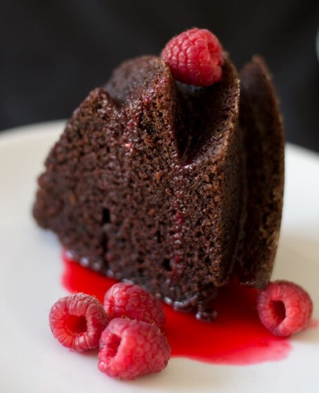 Black Garlic Chocolate Cake with Raspberry SaucePrep Time: 15 Min Cook Time: 45 MinServes 12The Cake1 cup (225 grams) unsalted butter⅓ cup (40 grams) cocoa powder1 teaspoon salt1 cup (225 grams) water2 cups (240 grams) all-purpose flour1¾ cups (350 grams) sugar1½ teaspoons baking soda2 large eggs½ cup (120 grams) sour cream1 teaspoon vanilla extract1 head black garlic (For a less pungent flavour, start with half a head of black garlic and see if you're okay with more.)The Raspberry Sauce2 cups fresh raspberries. (frozen is fine if out of season)3 tablespoons sugar½ tablespoon lemon juiceInstructionsFor the cakePlace rack in the centre of the oven and preheat the oven to 180°CF., Butter and flour the inside of a 10-cup Bundt or ring cake tin.In a medium saucepan, combine butter, cocoa powder, salt, and water. Melt over medium heat, stirring to combine. Remove from heat and set aside.In a large mixing bowl, whisk together flour, sugar, and baking soda. Gradually pour in the chocolate mixture, whisking constantly with your opposite hand, until the mixture is smooth. Add eggs, one at a time, whisking until combined after each addition. Whisk in the sour cream and vanilla extract until smooth.Chop the head of black garlic in half, then remove cloves from the skin and place in a small mixing bowl. Mash cloves into a paste with the back of a spoon. Whisk the black garlic paste into the cake mixture until smooth.Pour the mixture into your prepared cake tin and bake until a toothpick or cake tester inserted in the cake comes out clean, 40-45 minutes. Place pan on a wire rack to cool for 15 minutes, then invert the cake onto the wire rack and let it cool completely.For the Raspberry SauceCombine all ingredients in a saucepan. Cook over medium heat, mashing the raspberries slightly, until raspberries are broken down, about 8-10 minutes. Remove from heat and strain into a liquid measuring cup through cheesecloth or a fine mesh strainer to remove the seeds.Pour over the top of the cake, then serve (with fresh raspberries, if desired).